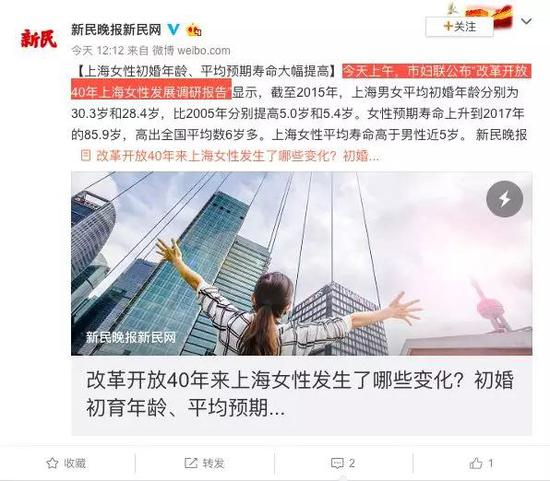 截至2015年,上海男女的平均初婚年齡分別為30.3歲和28.4歲,比2005年分別提高了5.0歲和5.4歲,比2010年分別提高了1.5歲和1.9歲。2015年,上海女性的初育年齡為29.0歲,已經高于很多西方發達國家,與歐盟平均水平持平。