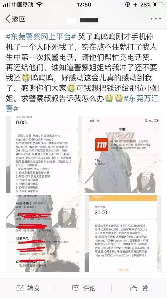 “我平時(shí)是一個(gè)很‘喪’的人,那天自己很傷心,也很害怕,都不敢想象110真的給我充話費(fèi)了。”小竇說(shuō),在這座陌生的城市里,她感受到了來(lái)自于陌生人的溫暖,“真的很感動(dòng),當(dāng)時(shí)我給我朋友說(shuō)的時(shí)候,我都感動(dòng)得又哭了一次。”