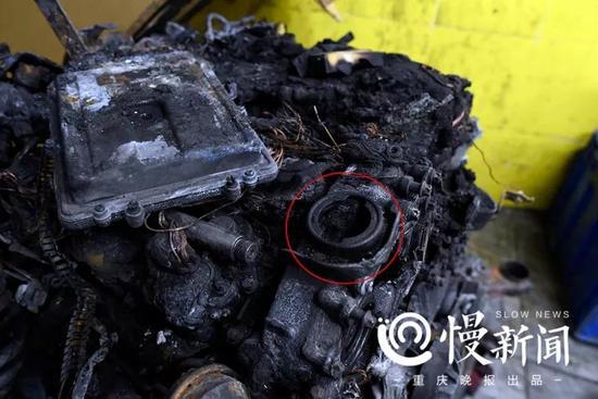 26日,慢新聞記者發現,被燒毀的發動機上仍能看到那個因未加蓋溢漏出機油的機油口,其四周有不同程度黑泥或炭狀物。讓王勇憤怒的是,火災帶來了家庭不小的變故。