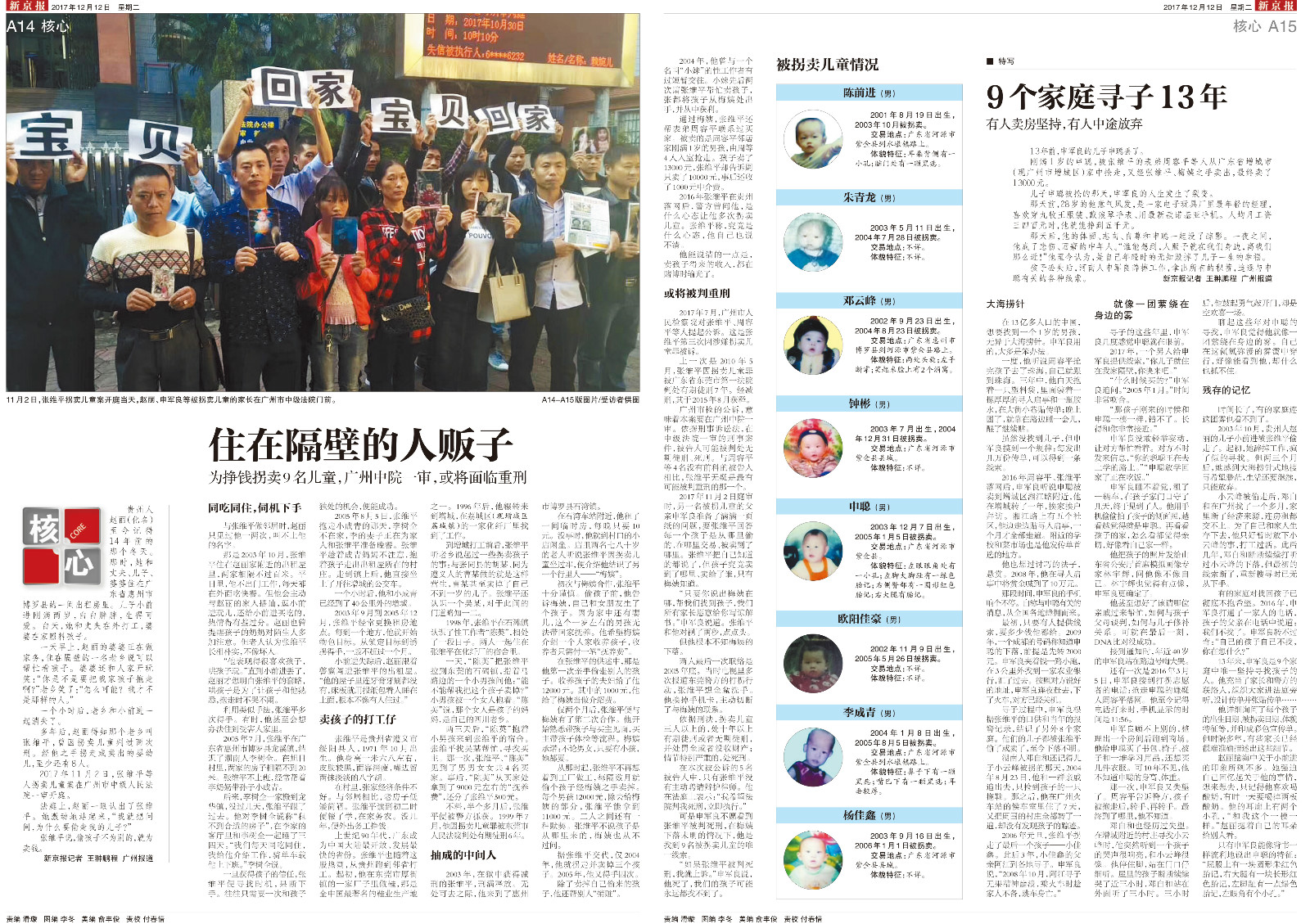 申軍良:對(duì)我們家長(zhǎng)來說,肯定是把這些人販子判得越重越好,孩子被拐賣對(duì)一個(gè)家庭是致命的打擊。再過幾天,我找孩子就整整十四年了,人販子終于受到了懲罰,我心里是欣慰的。但是想到我的孩子還沒有找回來,又感到很難受。我沒有嚎啕大哭,一直強(qiáng)忍著淚水,等待宣判結(jié)束。