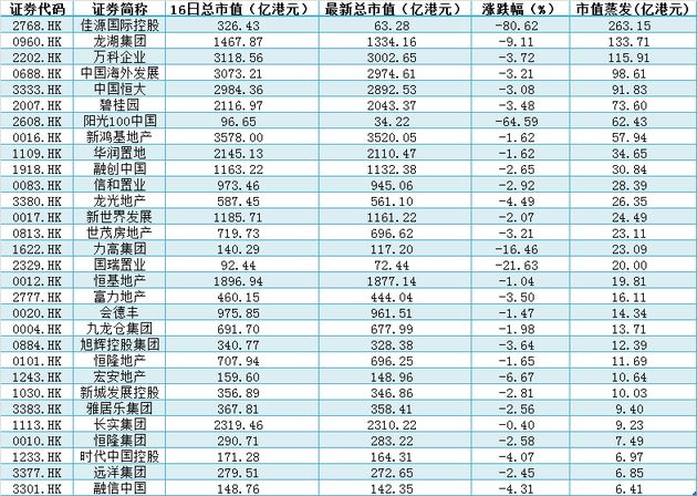 佳源國際控股大跌80%,仁天科技控股跌73%,弘達金融控股跌68%;陽光100中國一度暴跌逾70%,股價不足1元,淪為仙股,最終收跌64%。