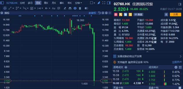半年前,沈天晴曾表示,上市兩年來佳源國際一直在做大做強,股價漲幅高達600%,從上市時的2.48港元/股漲到16.36港元/股。但他一定沒想到,兩年的成績,一個下午就被“打回原形”。