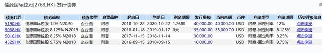 據彭博,佳源國際控股一只4億美元規模、12%利率、于2020年到期的債券下跌,創出歷史最低水平;此外,記者查詢Wind發現,該公司曾于2018年1月18日發行了一筆3.5億元高息美元債,利率為8.125%,今日(2019年1月17日)到期。