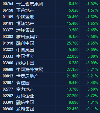 碧桂園領跌藍籌;融創中國2.65%;陽光100中國跌65%;國瑞置業跌21%。