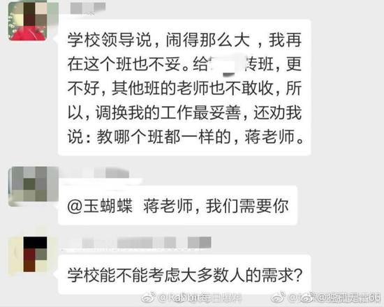 此外,蔣玉芬還表示,學(xué)校領(lǐng)導(dǎo)稱,事情鬧那么大,她再在這個班也不妥,給當(dāng)事學(xué)生轉(zhuǎn)班更不好,其他老師也不敢收,所以調(diào)換她的工作最妥善。“校長打來電話,說保留該學(xué)生在三年二班,換我這個班主任,我平靜接受。沒事的,雖然家長拉黑了我的電話,但我理解你特殊職業(yè)的憂女之母心,都是為了孩子,我教哪個班都一樣的。”