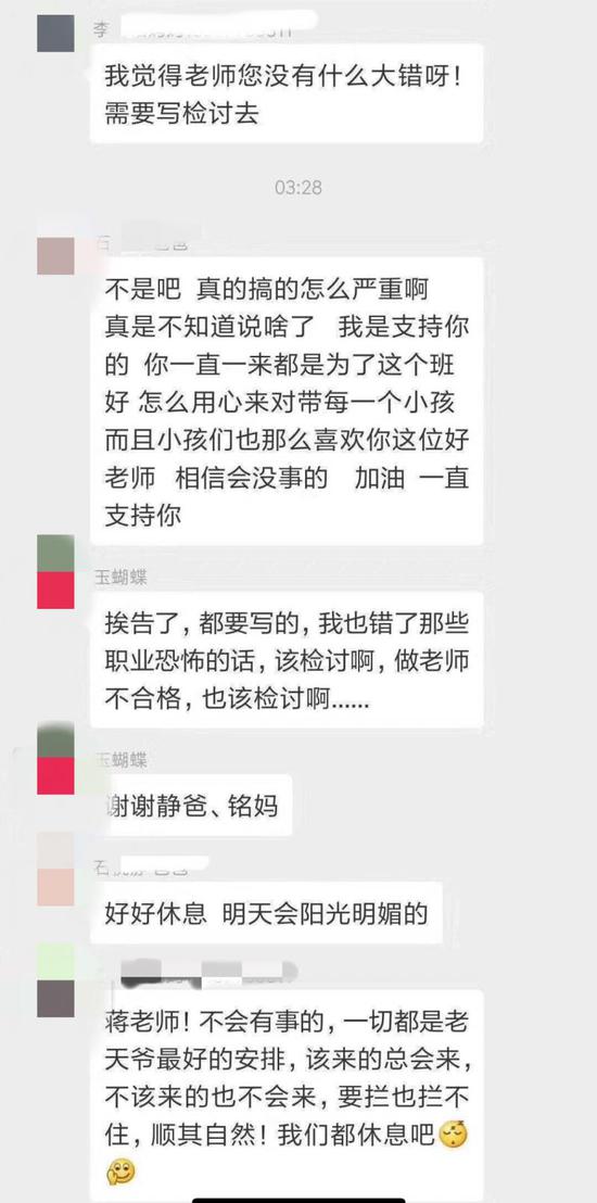 對于蔣玉芬在三年二班家族群中的這些說法,有的家長對她表示安慰和支持,并有家長認為“老師沒有什么大錯,需要寫檢討的”。此外,還有多名家長對于該老師不能再擔(dān)任三年二班班主任一事表示“無法接受”,并認為“一個人影響了54個人,54個家庭”。