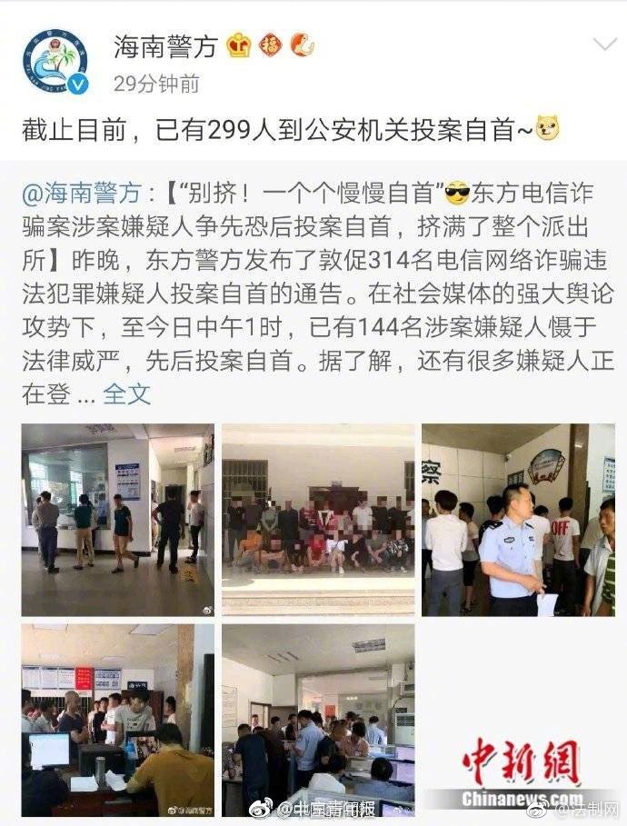海南警方近日雷霆出擊電信網(wǎng)絡(luò)詐騙,并于18日發(fā)布公告敦促314名嫌疑人自首。至19日18時(shí),已有299名涉案嫌疑人懾于法律威嚴(yán),先后投案自首。警方甚至發(fā)布微博“別擠!一個(gè)個(gè)慢慢自首”。據(jù)警方介紹,游戲幣充值詐騙早在七八年前就已出現(xiàn),如今在海南省東方市形成了成熟的黑色產(chǎn)業(yè)鏈條。警方已打掉33個(gè)團(tuán)伙,破案1800余起。