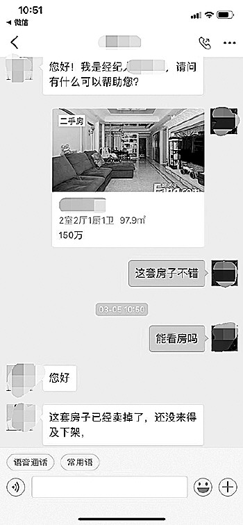 記者立即以購房者身份聯系了該房源的房產經紀人。“這套房子已經賣掉了。”該經紀人說,“可以給您推薦其他的房子。”為何已經賣掉的還掛在網站上呢?該房產經紀人表示“還沒來得及下架”,隨后開始詢問起記者的購房意向。