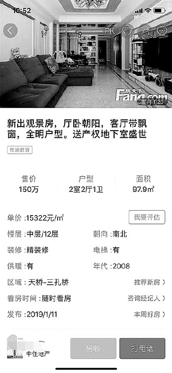5日上午,記者用手機打開一款名為“房天下”的軟件,搜索附近熱門房源。很快,一處面積97.9㎡、總價150萬元的房源引起了記者注意。
