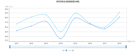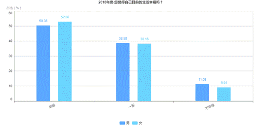 大調(diào)查發(fā)現(xiàn),女性受訪者(52.86%)選擇幸福的比例略高于男性(50.36%)。這已經(jīng)是連續(xù)8年,女性受訪者選擇幸福的比例高于男性。