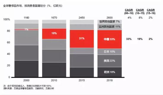 無論如何,中國消費(fèi)者在全球奢侈品市場(chǎng)的消費(fèi)不容忽視。根據(jù)貝恩提供的數(shù)據(jù),中國購買者的奢侈品消費(fèi)總額已占全球市場(chǎng)份額的33%,也就是說,中國人在2018年買走了全球差不多三分之一的奢侈品。而3年前這個(gè)比例是31%,18年前這個(gè)數(shù)字只有1%。