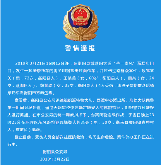 2019年3月21日16時12分許,在衡陽縣城蒸陽大道“芊一麥風”蛋糕店門口,發生一起騎摩托車的男子用鋼管擊打面包車,并打傷過路群眾案件,致鄒某關(男,72歲,衡陽縣人)、王某美(女,60歲,衡陽縣人)、周某(女,24歲,蒸湘區人)、魏某玲(女,35歲,衡陽縣人)4人受傷,該男子砍傷群眾后騎摩托車向衡陽市方向逃跑。