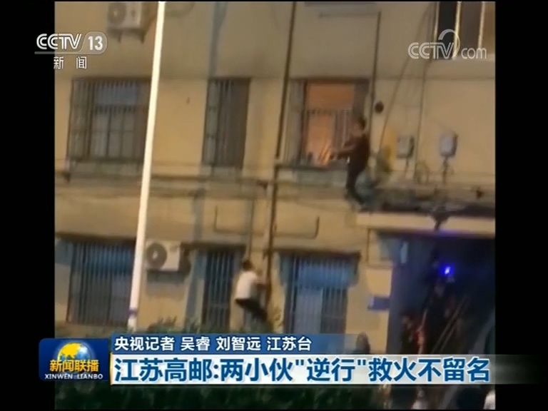 央視網消息(新聞聯播):前不久,在江蘇高郵,路過的行人發現二樓一居民家的廚房著火,火光越來越大。兩名年輕人不顧自身危險挺身而出,爬樓破窗救火,事后又不留姓名悄悄離開。