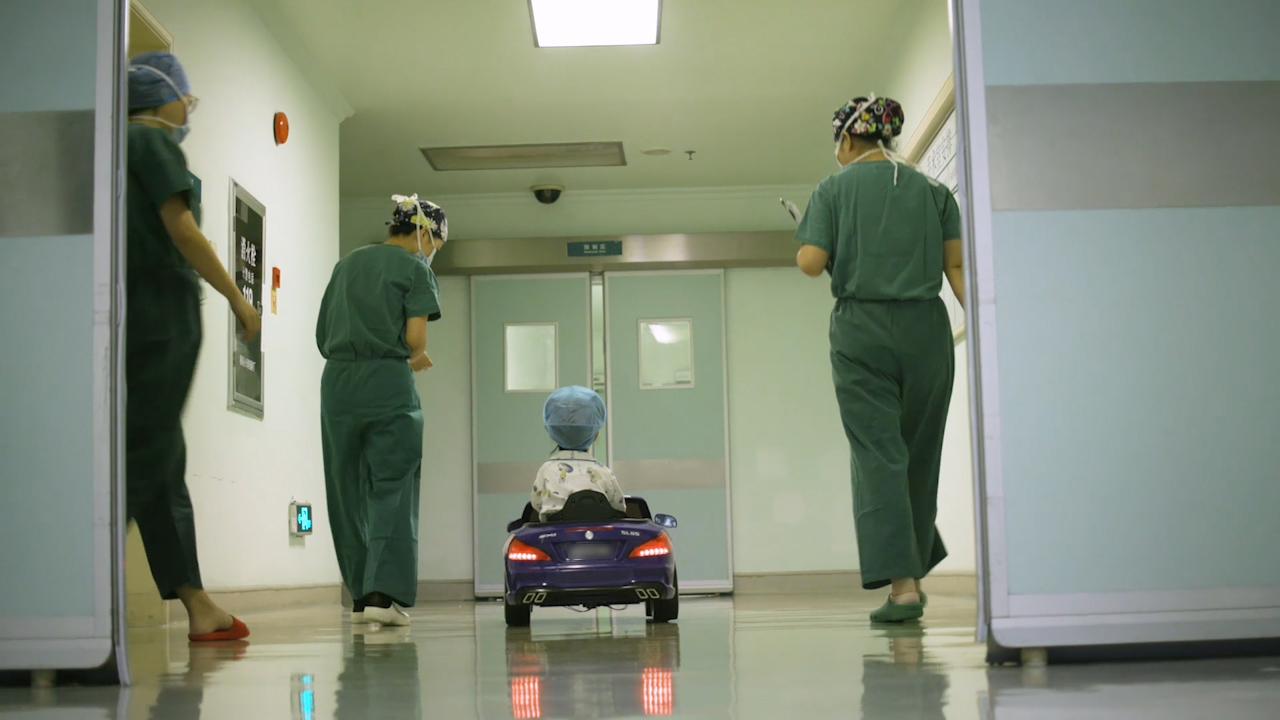 院方向澎湃新聞提供的一段視頻顯示,一個(gè)戴著手術(shù)帽的小患者坐在一輛藍(lán)黑色的“奔馳”玩具車上,由醫(yī)護(hù)人員操縱著手中的遙控器,緩緩向手術(shù)室方向駛?cè)ァW谲嚿希』颊叩淖⒁饬芸毂环稚ⅲ煽謶肿兊霉郧桑瑵u漸放松了緊張的情緒。