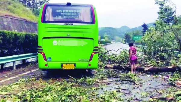 貴陽晚報訊 8月22日下午,滬昆高速麻江至凱里路段,一輛載客大巴車行駛途中遭遇驚魂一刻:狂風暴雨中,一棵大樹被連根拔起,狠狠地砸向客車……所幸司機冷靜操作,化解了這一危險。