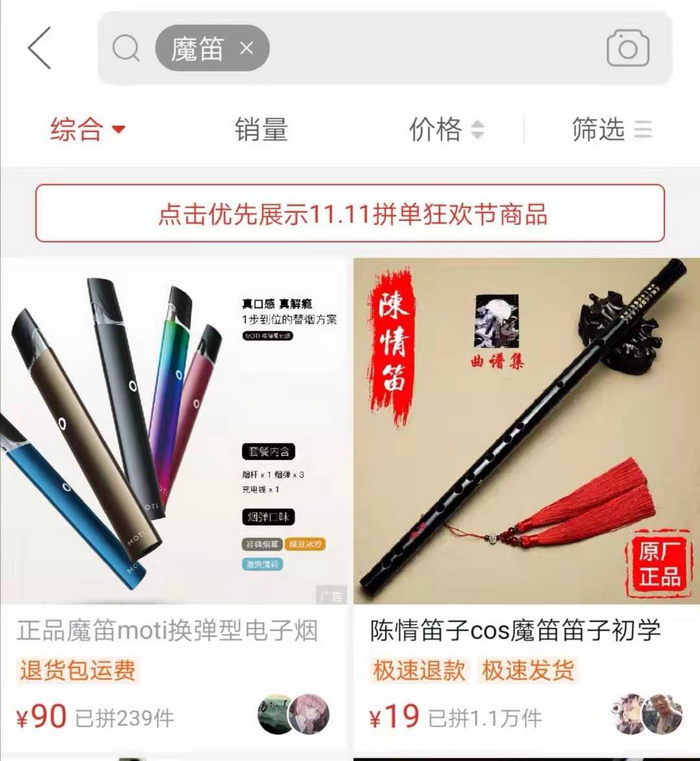 在拼多多上搜索電子煙品牌,會出現相關產品。