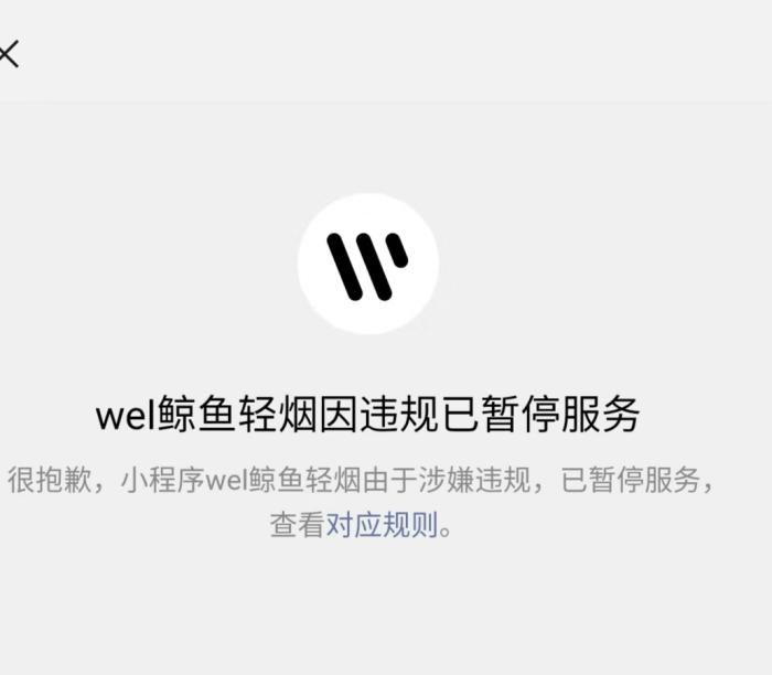 鯨魚輕煙微信商城顯示因違規暫停服務。