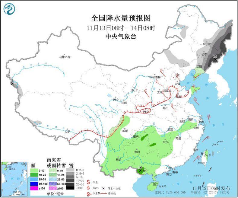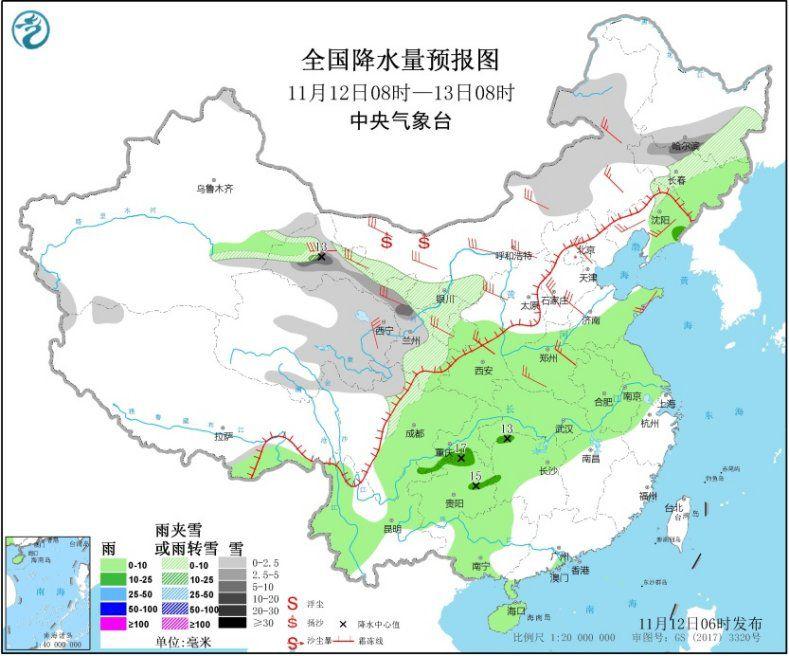 11月12日08時至13日08時,西北地區中東部、內蒙古中東部、東北地區西部和北部等地的部分地區有小到中雪或雨夾雪,局地大雪或暴雪(10-13毫米);陜西中南部、東北地區東南部、黃淮、江淮、江漢、江南北部、西南地區東部和南部等地的部分地區有小雨,局地中雨。黃淮及其以北大部地區有4~6級風(見圖2)。