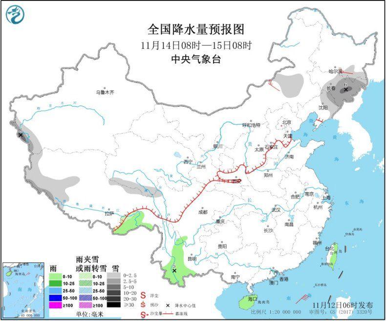 11月14日08時至15日08時,東北地區東部、內蒙古東部偏南地區、新疆南疆西部山區、西藏西部、青海西南部等地部分地區有小到中雪或雨夾雪,其中,吉林東部、南疆西部山區等地局地大雪(5~8毫米)。西藏東南部、云南中部和南部、海南島、臺灣島東部等地部分地區有小雨。內蒙古中部、東北地區中部等地部分地區有4~5級及以上風。臺灣海峽、巴士海峽將有7~8級、陣風9級的東北風(見圖4)。