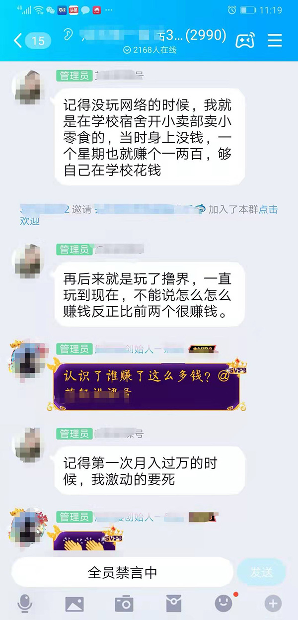 上述在QQ群直播介紹打假“吃貨”經驗的師傅們,均聲音稚嫩。其中一個群里講課者自稱自己是一名學生,今年才17歲,家里窮,沒玩網絡時,在學校宿舍開小賣部賣小零食。一個星期賺個一兩百,夠自己在學校花錢。后在快餐店當服務員,暑假每天汗流浹背,一天忙到晚,85元一天工資……再后來就是,“玩了擼界,一直玩到現在,不能說怎么賺錢,反正比前兩個賺錢。”“記得第一次月入過萬的時候,激動得要死,現在也是平時賣賣貨,玩玩退款和賠償。”