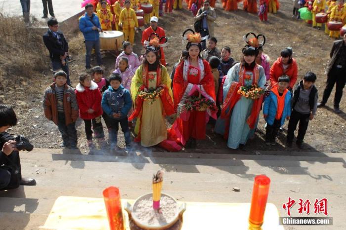 資料圖:民眾在“春姑娘”的帶領下祭拜灶神,當日是農歷臘月二十三,中國傳統“小年”。 中新社發 王中舉 攝