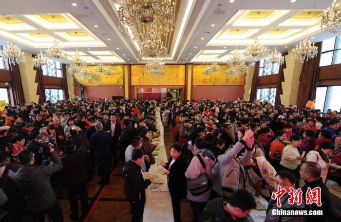 資料圖:農歷臘月二十三,是中國傳統的小年。在吉林長春,一千余名市民齊聚一堂共同包餃子\吃餃子。 劉棟 攝