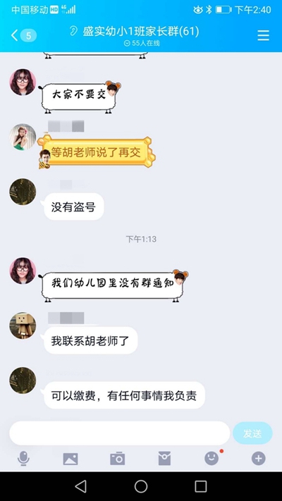 期間,有家長不放心河南收款方,直接給劉老師打電話確認,劉老師表示,從未發(fā)過通知。這位家長立刻通知群里其他家長:這是騙子,不要再轉(zhuǎn)賬。