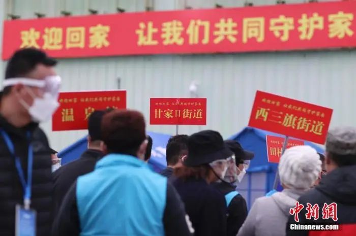 3月25日,北京市海淀區(qū)區(qū)級(jí)集中分流點(diǎn),街鎮(zhèn)工作人員舉牌迎接離鄂返京人員抵達(dá)。中新社記者 盛佳鵬 攝