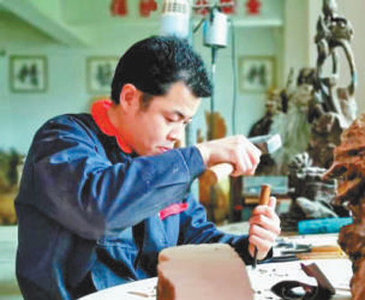 邊帶徒弟,邊練技藝。奉湘波先后獲得湖南省及全國殘疾人技能比賽的大獎,被評為技術能手。在一塊色澤灰暗的木墩上,刻刀上下翻飛,刀起刀落,木材特有的清香擴散,圖案慢慢呈現。奉湘波給我們展示了一下精湛的技藝。