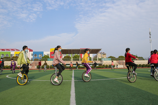 4月22日,江蘇省淮安市洪澤湖實驗小學的同學們在學習騎獨輪車。人民視覺供圖