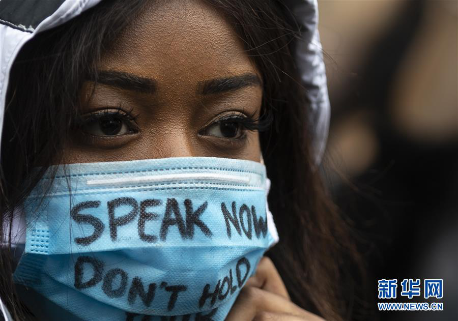 ●6月7日,英國倫敦舉行大型示威活動,抗議在美國發生的針對非洲裔群體的種族歧視行為,一名示威者在位于英國倫敦的美國大使館門前參加抗議活動。她的口罩上寫著“講出來,不要矜持”。