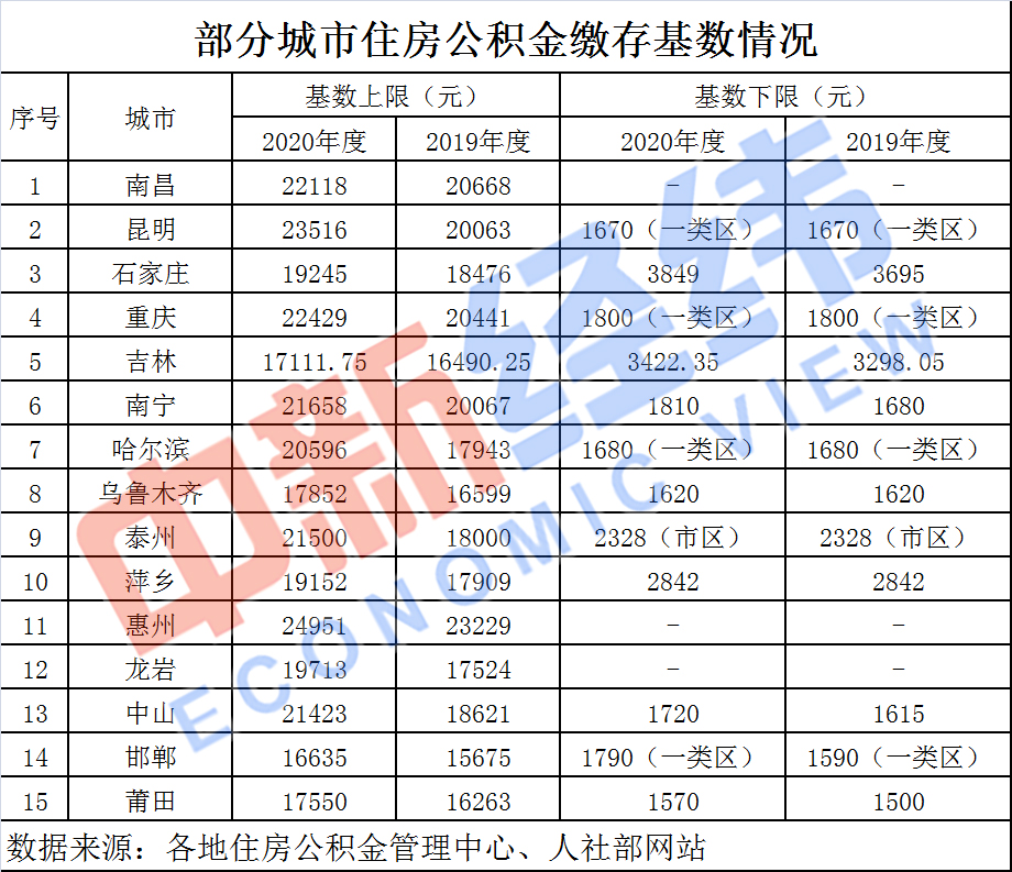 2020年度住房公積金繳存基數(shù)最高為19245元,最低為3849元。分別較上年度增加769元和154元。