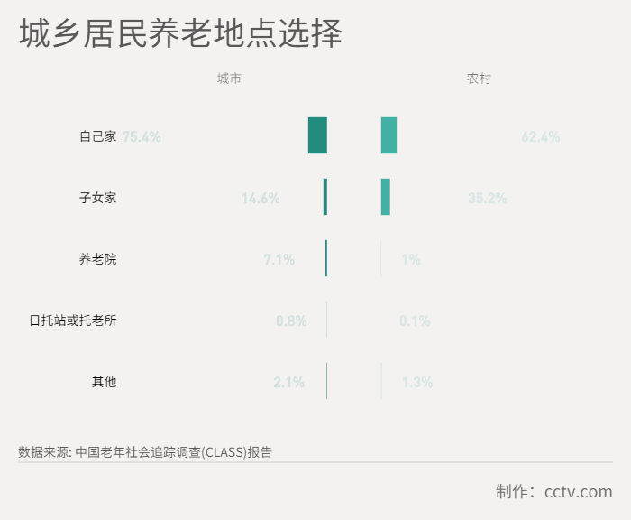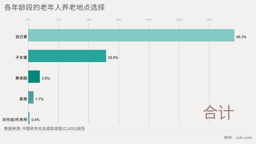 當子女無法滿足老人的需要時,他們會考慮住到養老院。超過半數的養老機構和老人住所的距離不超過2公里,但也有13.2%的老年人需要走20公里才能找到一家養老院或敬老院。