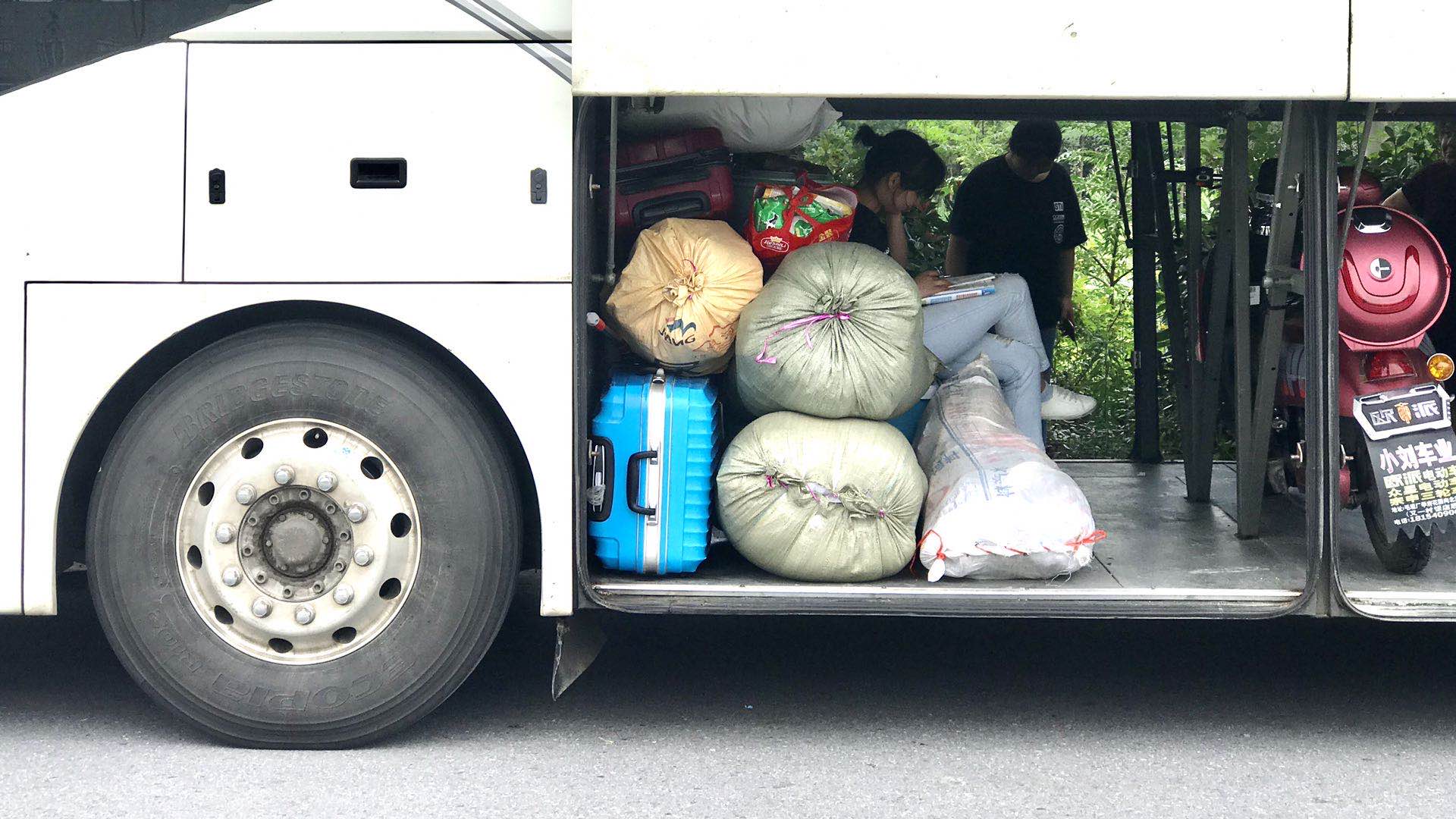 離校日,家長(zhǎng)和學(xué)生一起乘車趕往公交車站。