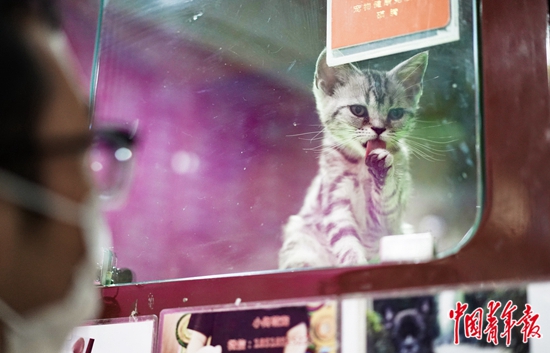 北京三里屯一寵物店內(nèi),一位顧客正在觀察小貓洗臉。