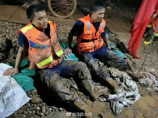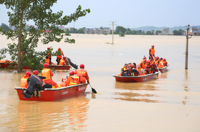 △江西鄱陽,準備前往救援的消防隊員沖鋒舟與搭乘被困村民返回的沖鋒舟相遇。