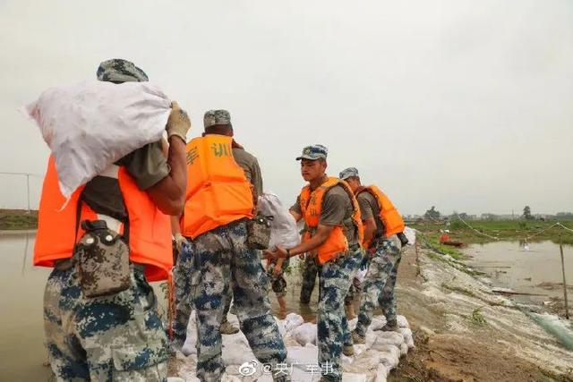 △ 14日,解放軍戰士正在江西九江廬山市南康堤抗洪搶險加固子堤。