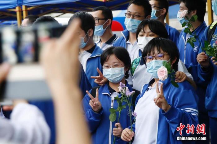 資料圖:7月10日,北京第八十中學(xué)(望京校區(qū))高考考點(diǎn)外,北京朝陽(yáng)外國(guó)語(yǔ)學(xué)校的考生們合影。當(dāng)日,為期4天的北京地區(qū)2020年高考結(jié)束。 中新社記者 韓海丹 攝