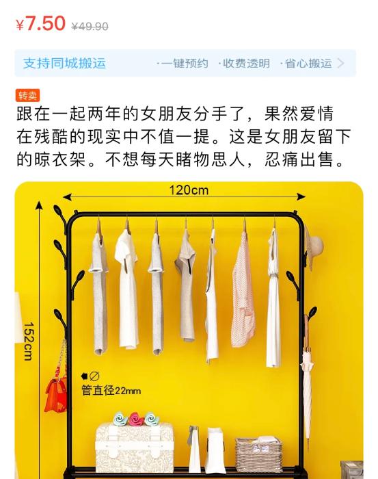 二手電商領(lǐng)域也差不多,有經(jīng)驗(yàn)的賣家對商品的來源必定是要標(biāo)注清楚的, “和在一起2年的女朋友分手了,女朋友留下的晾衣架,忍痛出售,不想睹物思人。”