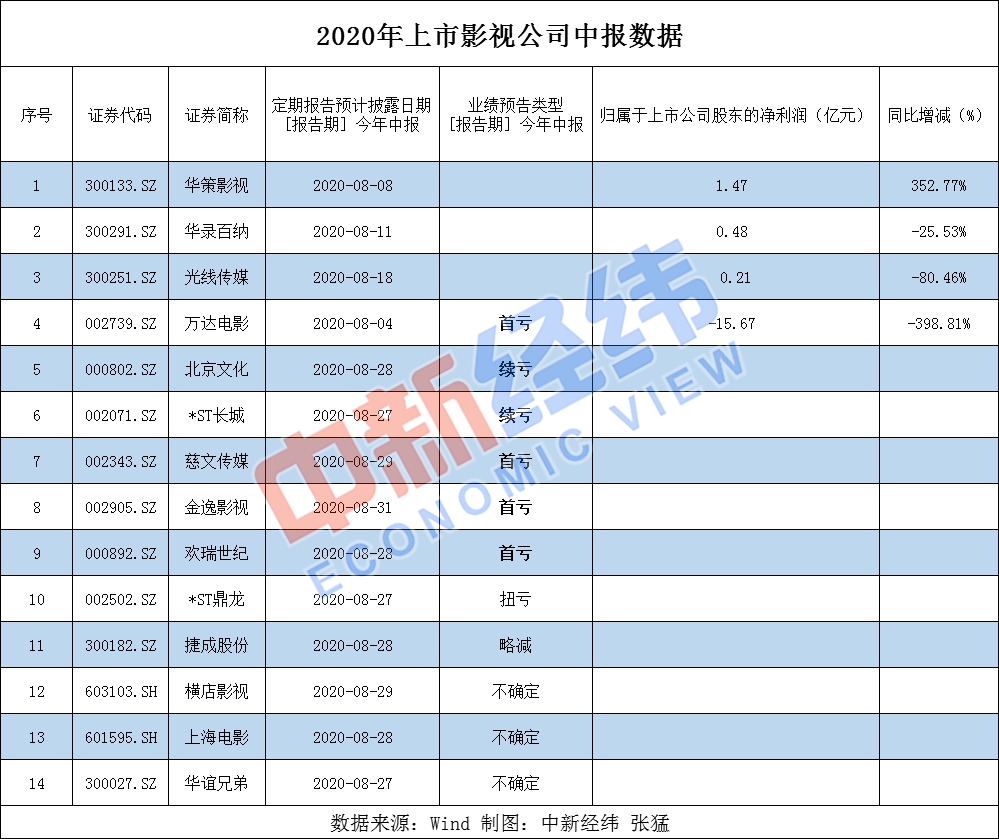 Wind數據顯示,截至8月19日,在20家影視相關上市公司中,已有14家公司發布半年報或半年度業績預告,其中6家公司虧損,4家盈利(2家凈利潤大幅下滑),一家業績略減,三家業績不確定。