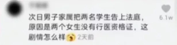 不過(guò),兩名女生的上述行為卻引來(lái)部分網(wǎng)友的“惡評(píng)”。有網(wǎng)友稱(chēng),“次日男子家屬把兩名學(xué)生告上法庭,原因是兩個(gè)女生沒(méi)有行醫(yī)資格證,這劇情怎么樣。”該留言獲得了6.1萬(wàn)的點(diǎn)贊。
