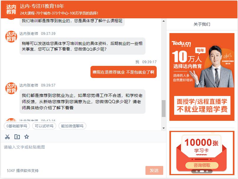 中新經(jīng)緯客戶端以學(xué)員身份就此向達(dá)內(nèi)教育客服咨詢,客服稱,培訓(xùn)都是推薦到就業(yè)的。“都是推薦到您就業(yè)為止,如果您覺得工作不合適,和學(xué)校老師反饋,重新給您推薦到您滿意為止?!边_(dá)內(nèi)教育客服稱。但對(duì)于能否賠付學(xué)費(fèi)的問題,客服始終沒有正面回答。