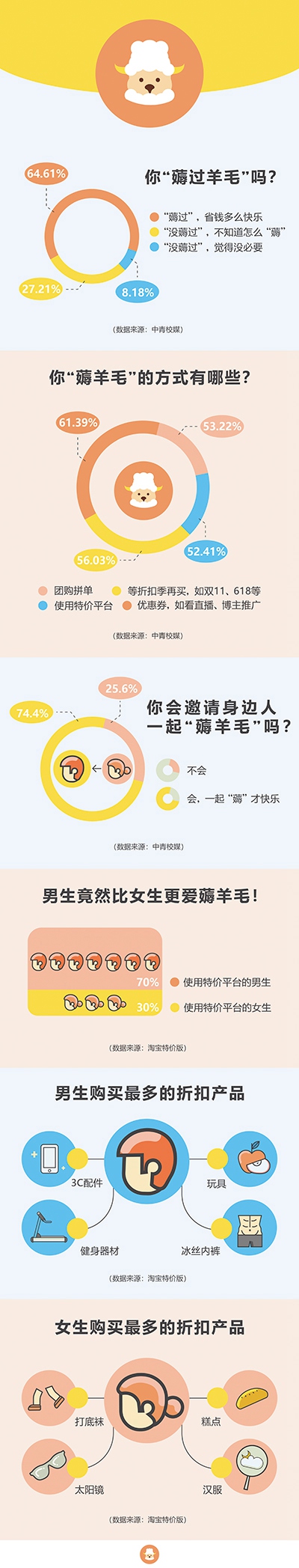 所謂“薅羊毛”,就是搜尋、利用商家的優惠信息,在網絡和朋友圈子中廣為傳播,從而為自己省錢的行為。近日,中青校媒與淘寶特價版面向全國高校大學生展開消費習慣調查,結果顯示,64.61%的大學生都有過“薅羊毛”的經歷,甚至因此而感到一種特別的快樂。