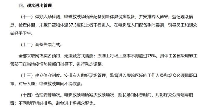 需要指出的是,雖然影院上座率上調(diào)到75%,但具體由各省級電影主管部門在當?shù)匾咔榉揽夭块T指導下,進行動態(tài)調(diào)整。對觀眾而言,仍需要采用網(wǎng)絡實名預約、無接觸方式購票,在觀影過程中也需要遵守防疫規(guī)定,如登記、查體溫、觀影過程中佩戴口罩等等。