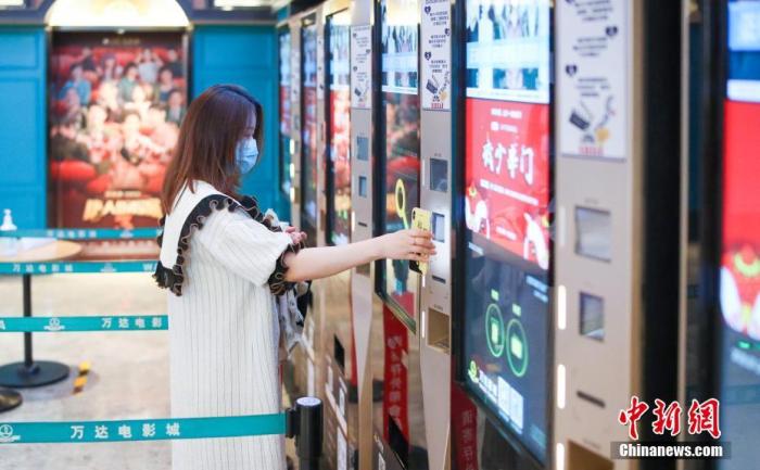 資料圖:7月24日,觀眾在北京萬達影城CBD店內(nèi)自助掃碼取票。中新社記者 賈天勇 攝