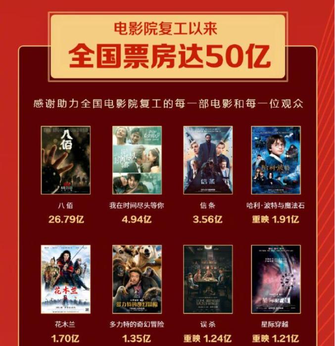 幾天前,電影行業(yè)還迎來了一個振奮人心的消息,據(jù)貓眼專業(yè)版數(shù)據(jù),截至9月14日19時29分,全國電影院復工以來(7月20日-9月14日)累計票房達到50億人民幣。其中《八佰》單片的貢獻超過了半壁江山。
