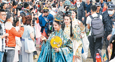 10月5日,江蘇省常州市金壇區(qū)東方鹽湖城風(fēng)景區(qū)舉辦國(guó)風(fēng)大典活動(dòng)。圖為來自全國(guó)各地的漢服達(dá)人參加漢服展示活動(dòng)。夏晨希攝(人民視覺)