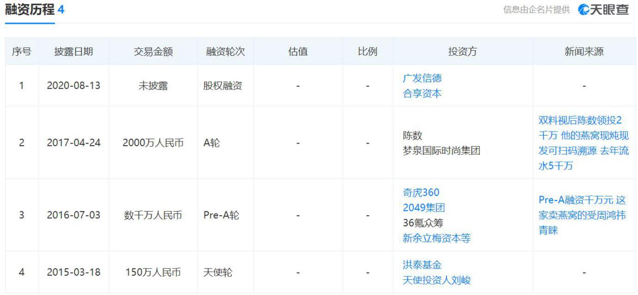 資本也看好燕窩行業的發展。以網紅燕窩品牌小仙燉為例,據天眼查,小仙燉背后所屬公司為深圳市榕樹堂生物科技有限公司,該公司成立于2012年7月19日,法定代表人為林小仙。目前,小仙燉已完成四輪融資,投資人包括洪泰基金、奇虎360、2049集團、知名演員陳數等。