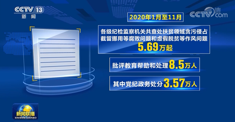 2020年1月至11月,各級紀(jì)檢監(jiān)察機(jī)關(guān)共查處扶貧領(lǐng)域貪污侵占、截留挪用等腐敗問題和虛假脫貧等作風(fēng)問題5.69萬起,批評教育幫助和處理8.5萬人,其中黨紀(jì)政務(wù)處分3.57萬人。