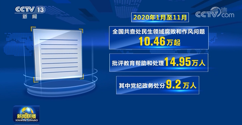 與此同時(shí),各級紀(jì)檢監(jiān)察機(jī)關(guān)深入開展民生領(lǐng)域損害群眾利益問題集中整治,持續(xù)糾治教育醫(yī)療、就業(yè)創(chuàng)業(yè)、養(yǎng)老社保、環(huán)境保護(hù)等領(lǐng)域腐敗和作風(fēng)問題,保障人民合法權(quán)益,推動解決群眾“急難愁盼”事。2020年1月至11月,全國共查處民生領(lǐng)域腐敗和作風(fēng)問題10.46萬起,批評教育幫助和處理14.95萬人,其中黨紀(jì)政務(wù)處分9.2萬人。